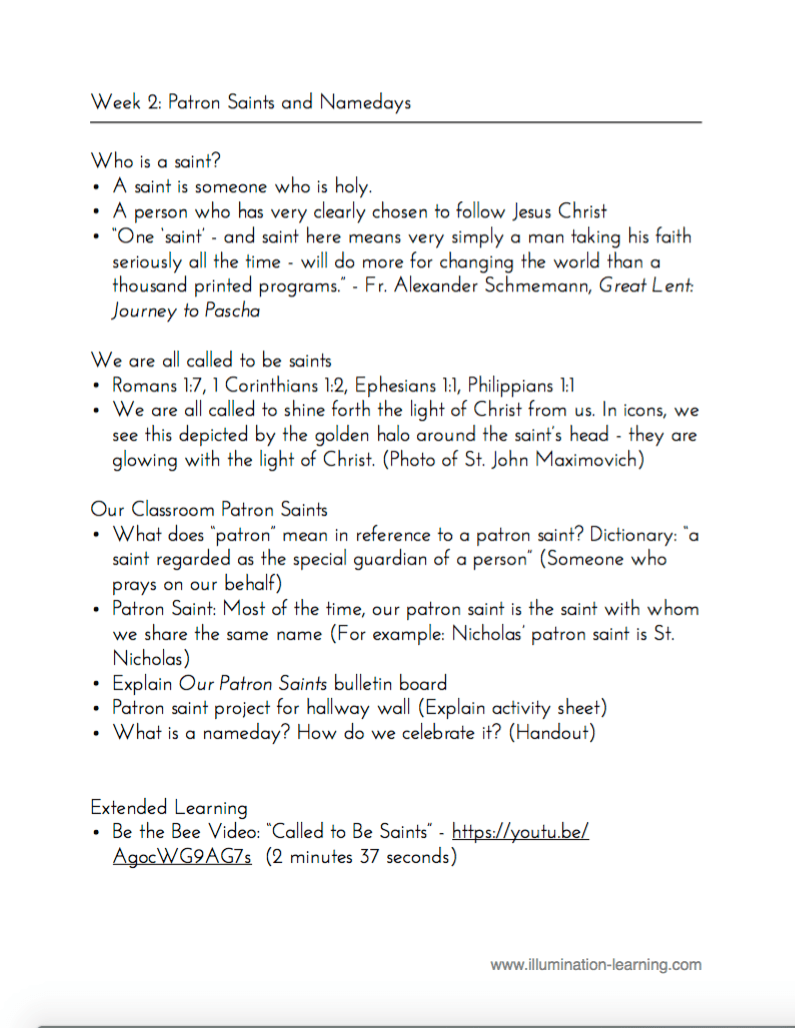 Each child receives this handout 2 weeks prior to their nameday. They complete the activity at home and return it the following Sunday. Each student can share their work with the class before learning more about their saint for our classroom bulletin board. These handouts are hung up in our hallway to display for parents.