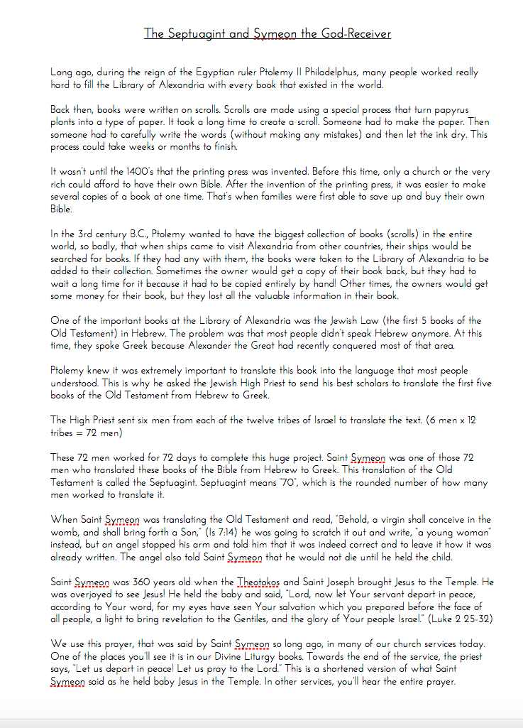 Here are the resources I used while researching about the Septuagint and Symeon the God-Receiver. It’s completely up to you if you want to use these resources strictly for yourself or incorporate them into your lesson. I did not use the videos for my Sunday School class (although I think it would be great to share them with the students) but I did use them with my older boys this past week since we are also studying about the Bible and the Divine Liturgy for our homeschool year.
