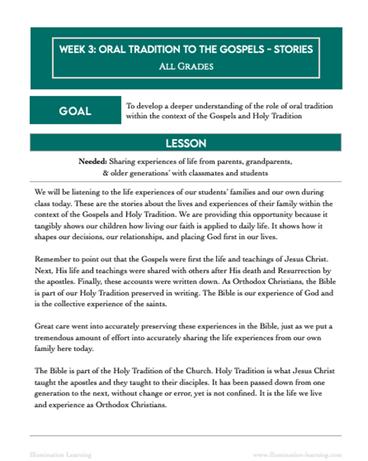 Goal: to develop a deeper understanding of the role of oral tradition within the context of the Gospels and Holy Tradition
