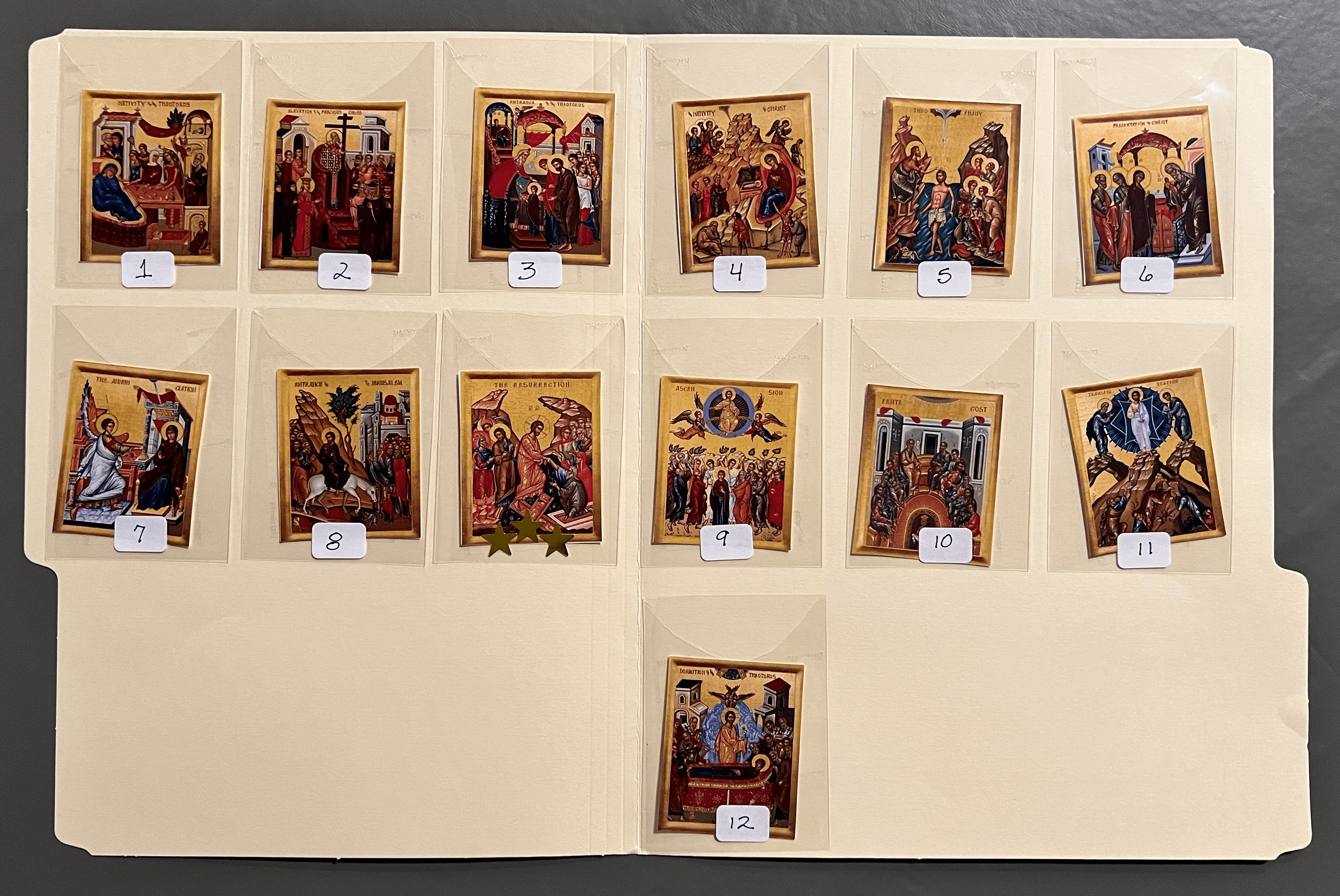 We created a couple of file folder activities for our youngest classes this year: 1) The major feast days and 2) Icons on our iconostasis. From our experience, I think the velcro dots on the back of the laminated icons work better for little hands who are still developing their fine motor skills than pockets, but use what works best for your children and what you have available to you. These file folder activities will be used over again next year as well.